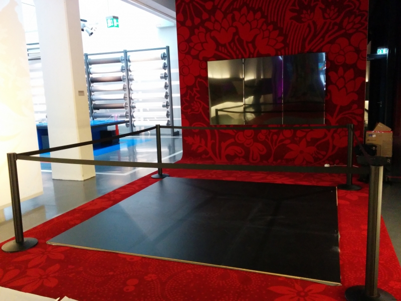 The moving fabrics are shown as a video collage on a triptychon represented by three large television screens. By moving across the SensFloor in front of the triptychon, the visitor can interact with the video collage and depending on their movements and position they interweave new visual fabrics and unique audio patterns. For the interactive installation, I used the openFrameworks toolkit for creative coding.